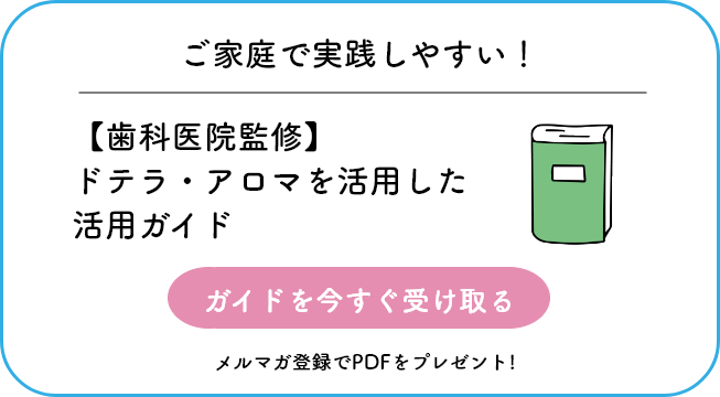なりとみ歯科では、外科治療(インプラント手術も含む)前にdoTERRA(ドテラ)社の前述のディープブルーラブ、ペパーミント、ブレンドオイルのオンガードを応用しています。 これらのリラックス効果、抗菌効果により術中の痛みや不快な症状を緩和できます。また、リラックス効果により血圧の安定も期待できます。